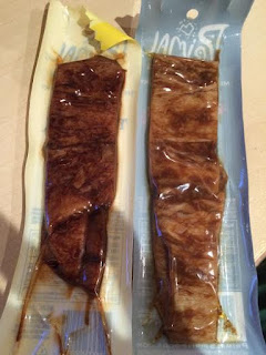 The package to this one claims to be Earth Friendly, which is odd because the other one does not include that addendum. I have to assume the other jerky was made the Exxon Valdez oil spill where so many innocent tofu babies were affected. But let't move on to some Texas BBQ flavored meatless jerky. Flavors include: isolated soy protein, cane juice, soy sauce, soybeans, natural smoke flavoring and natural vegetarian spices. Basically everything a growing trucker needs to stay healthy. It's doing its best to LOOK like real jerky, but how does it smell? I can tell they tried their best to go for an "authentic" Texas BBQ smell, but it really just smells like a McRib without the Mc...or the RIB...or the reason to spend money on this. Alright, I'm going in for a taste.You know what this is? It's the "Rudy" of beef jerky. This little fella wanted so much to be beef jerky, but he never quite reached the success of his jerky brethren. It gets stuck in your teeth like jerky, and it has a rich BBQ taste to it, but just like Rudy...you'd rather be putting your money on someone you know can win and not the fat guy from Lord of the Rings. Maybe the other one will be better...